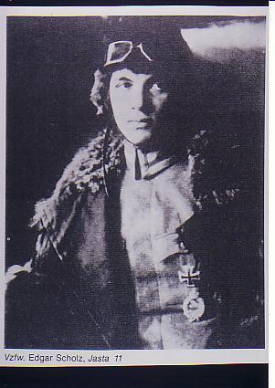 Edgar Scholtz wurde am 21. September 1898 in Suhl, Thüringen geboren. Im ersten Weltkrieg flog er bei der deutschen Fliegertruppe zunächst im Bombengeschwader der obersten Heeresleitung 2 und bei der Kampfeinsitzer Staffel 10, wo er auch seinen ersten Luftsieg errang. Im Januar 1918 wurde er zur Jagdstaffel 11 als Vizefeldwebel versetzt. Dort, in der "Richthofen-Staffel" erzielte er weitere fünf Luftsiege. |