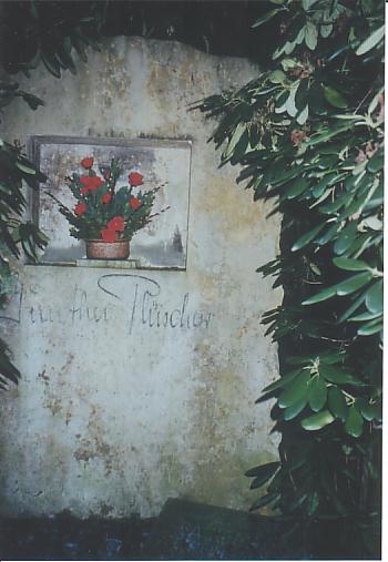 Das Grab Der Stein mit dem handschriftlichen Namenszug Plüschows weist eine Nische aus, in der, gerahmt von einem Metallgitter, ursprünglich eine Urne gestanden hat. |