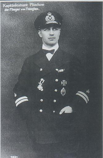 Kapitänleutnant a. D. GUNTHER PLÜSCHOW (1886 - 1931) Gunther Plüschow begann seine militärische Ausbildung 1898 als Kadett im Vorkorps Plön. Kam dann als Oberleutnant zur See noch vor Ausbruch des ersten Weltkrieges mit zwei Flugzeugen vom Typ Etrich A 2 Taube in das Schutzgebiet Kiautschou, um zusammen mit Leutnant Müllerskowski vom III. Seebataillon die Möglichkeiten eines militärischen Flugzeugeinsatzes in diesem Gebiet zu erproben. Während Müllerskowski kurz vor Kriegsbeginn bei einem Erprobungsflug abstürzte und schwer verletzt wurde, unternahm Plüschow im Raum Kiautschou (war seit 1898 deutsches "Pachtgebiet" und fiel im 1. Weltkrieg an Japan), erfolgreiche Aufklärungs- und Bombenflüge gegen die japanische Armee und Marine. Auf Befehl des Gouverneurs verließ Plüschow mit seinem Flugzeug bereits vor der Kapitulation die belagerte Festung Tsingtau und kam auf seiner Flucht über San Francisco, Gibraltar und England nach Deutschland zurück. |