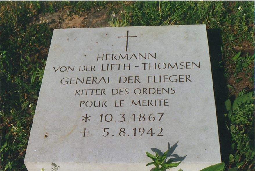 Hermann von der Lieth-Thomsen wurde am 10. März 1867 in Flensburg geboren. Er gehörte zu den Gründungsvätern der deutschen Militärluftfahrt. 1901 wurde er in den Generalstab berufen, dem er fast durchgängig bis Kriegsbeginn angehörte. Im Frühjahr 1914 wird Thomsen Generalstabsoffizier bei der Inspektion des Luft- und Kraftfahrwesens. Mit Berufung zum "Chef des Feldflugwesens" am 11. März 1915 kam Thomsen in das große Hauptquartier und wurde der Obersten Heeresleitung zugeteilt. Im Herbst 1916 wurde er bei Bildung des Stabes eines kommandierenden Generals der Luftstreitkräfte ernannt. Am 8. April 1917 erhält er den Orden "Pour-le-Merite". |