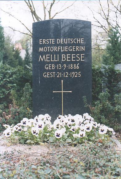Die Inschrift lautet: "Erste Deutsche Motorfliegerin, MELLI BEESE, geb.: 13.9.1886, gest.: 21.12.1925."